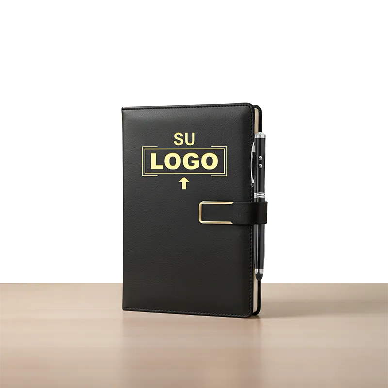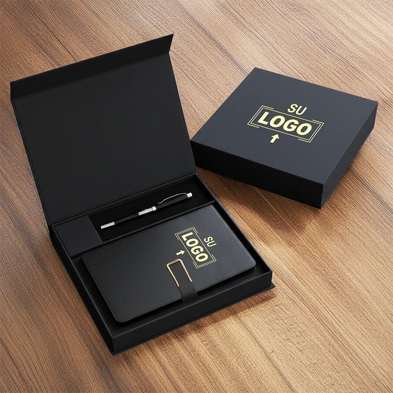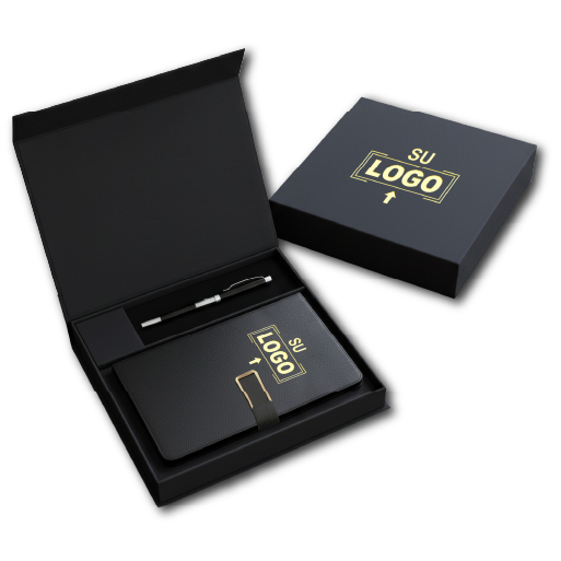 Agenda Premium + Bolígrafo 5 en 1: personalización de logo en la agenda y la caja.