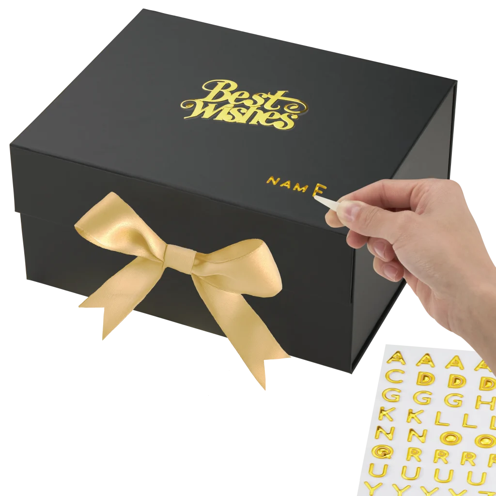 Cada una incluye lazo, tarjeta personalizada y letras doradas en 3D, para que usted mismo personalice su mensaje o nombre en la caja, disponibles en una elegante gama de colores.