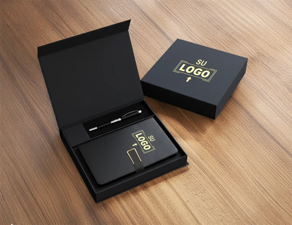 Un set elegante y personalizado que combina una agenda personalizada con pan de oro y un bolígrafo 5 en 1, todo dentro de una caja premium magnética personalizada. El detalle perfecto para destacar su marca con estilo.